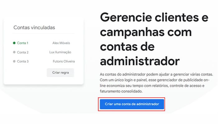 - Criar novas contas: Para novos clientes que ainda não têm uma conta no Google Ads.